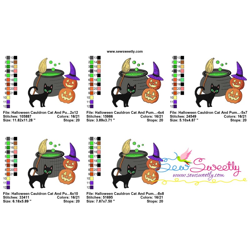 Halloween Cauldron Cat And Pumpkins Exclusive Machine Embroidery Design Pattern For Halloween Embroidery Projects.