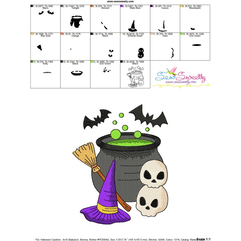 Halloween Cauldron Witch Hat And Skulls Exclusive Machine Embroidery Design Pattern For Halloween Embroidery Projects.