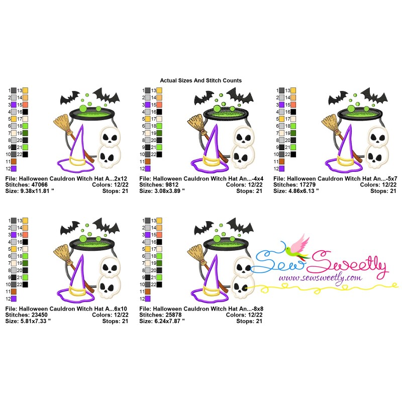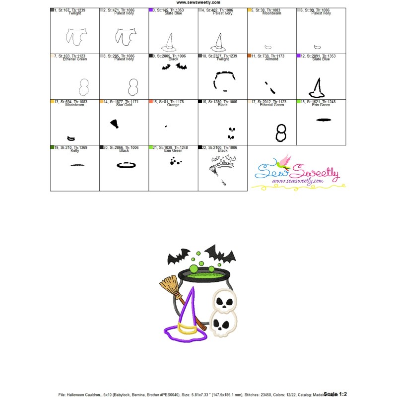 Halloween Cauldron Witch Hat And Skulls Exclusive Applique Embroidery Design Pattern For Halloween Embroidery Projects.