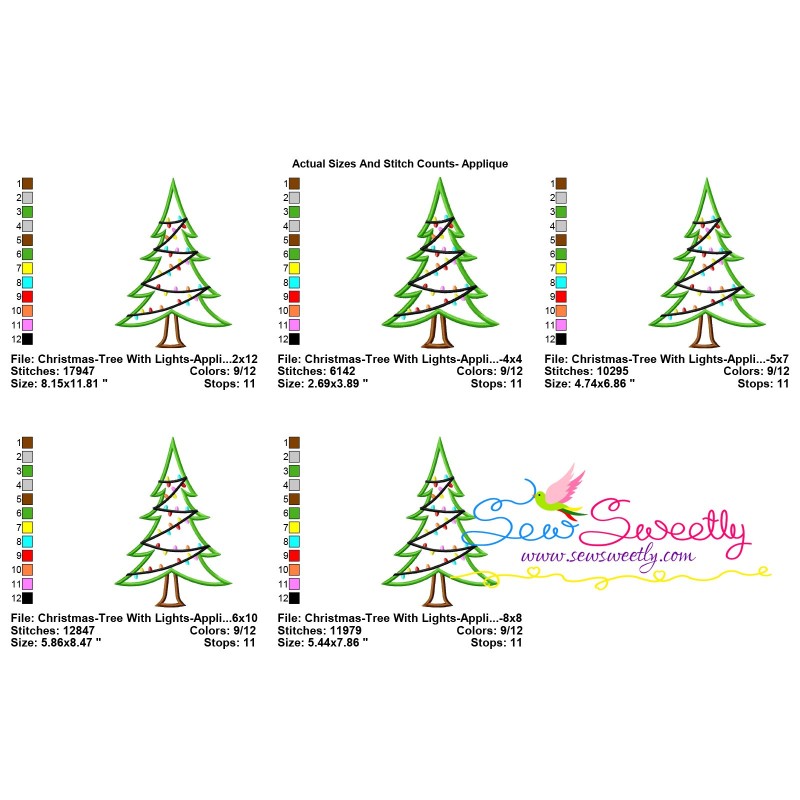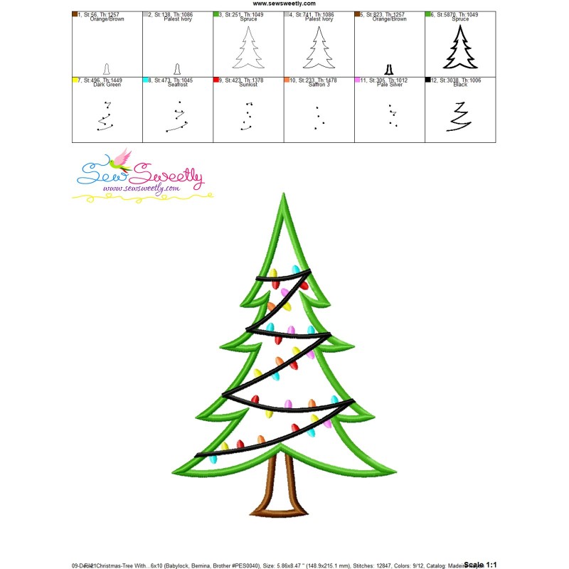 Christmas Tree With Lights Applique Embroidery Design Pattern For Christmas Embroidery Projects.