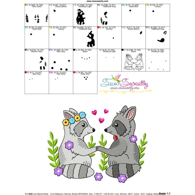 Just Married Bride and Groom Raccoons Valentine Embroidery Design Pattern