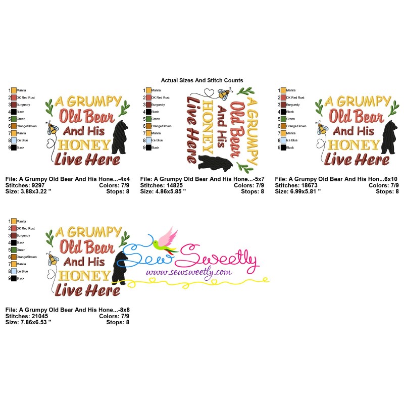 A Grumpy Old Bear And His Honey Live Here Bee Lettering Machine Embroidery Design Pattern.