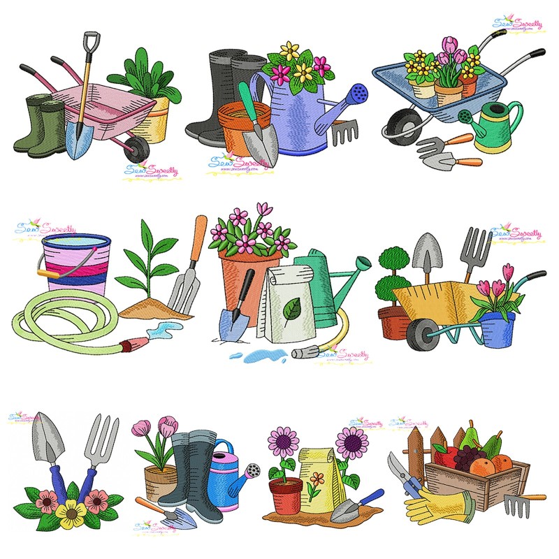 This embroidery design bundle includes 10 exclusive plant and tools machine embroidery designs.