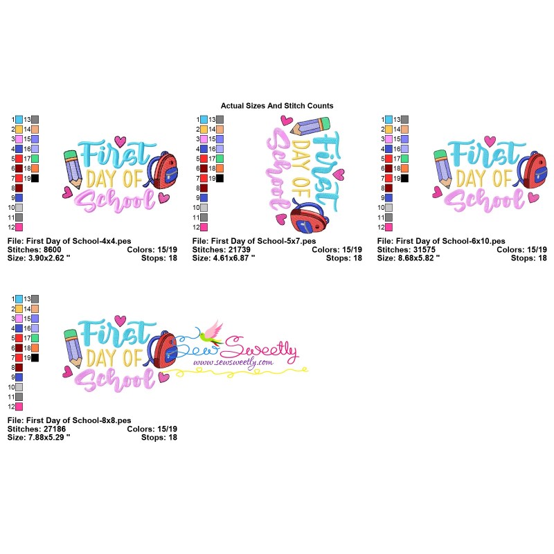 First Day of School Lettering Exclusive Machine Embroidery Design Pattern For Back To School Embroidery Projects.