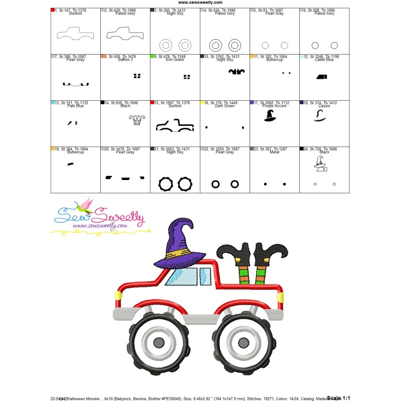 Halloween Monster Truck Witch Legs And Hat Exclusive Applique Embroidery Design Pattern For Halloween.