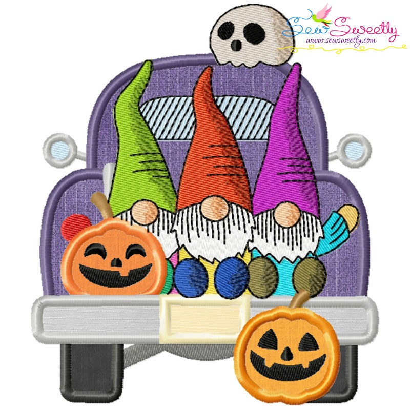 Halloween Truck Gnomes And Pumpkins Exclusive Applique Embroidery Design Pattern For Halloween.