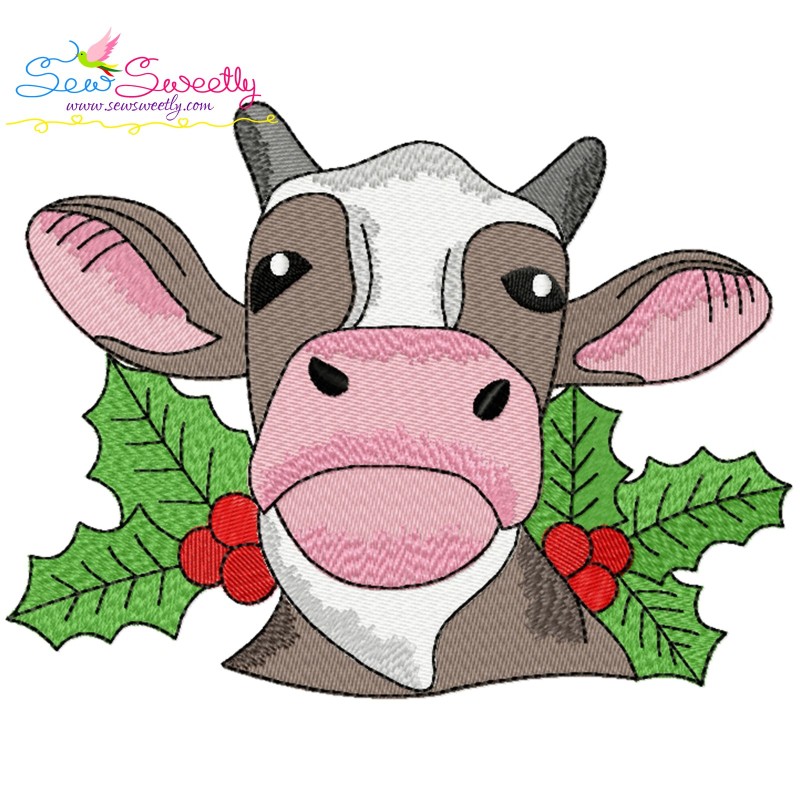 Christmas Cow With Holly Leaves Embroidery Design Pattern-1