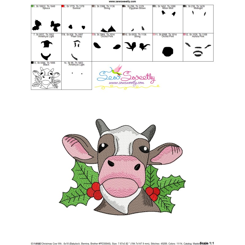Christmas Cow With Holly Leaves Exclusive Machine Embroidery Design Pattern For Christmas.