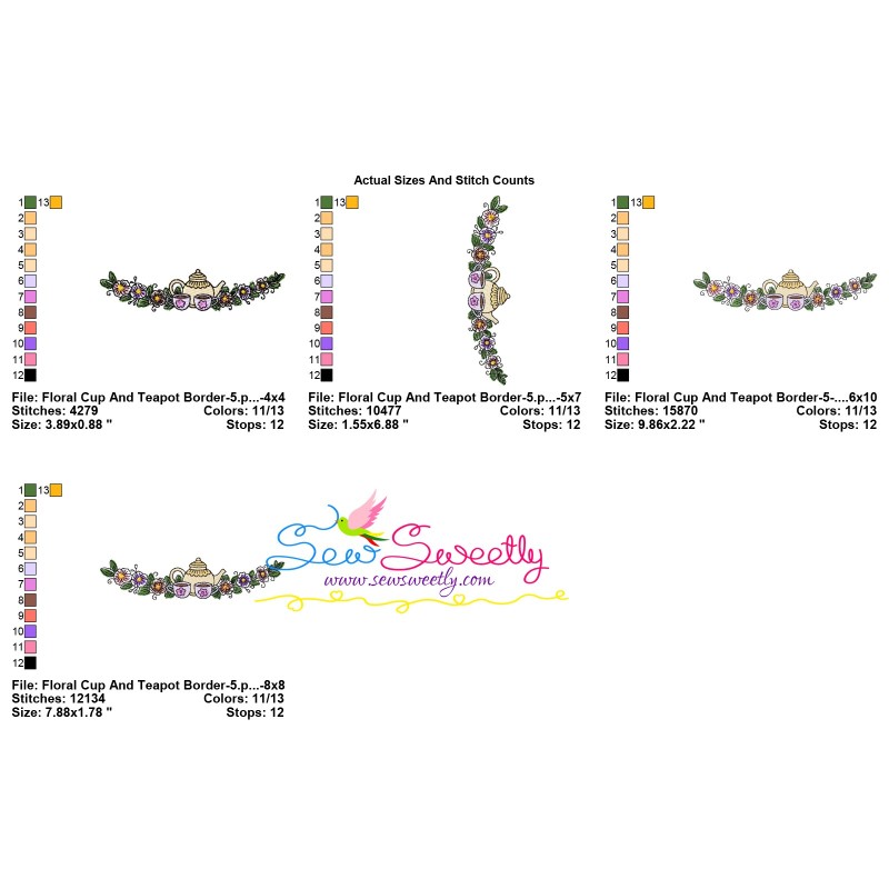 Floral Cup And Teapot Border-5 Exclusive Machine Embroidery Design Pattern For Kitchen Projects.