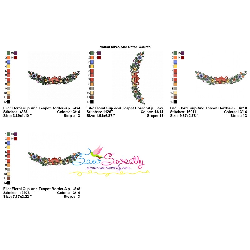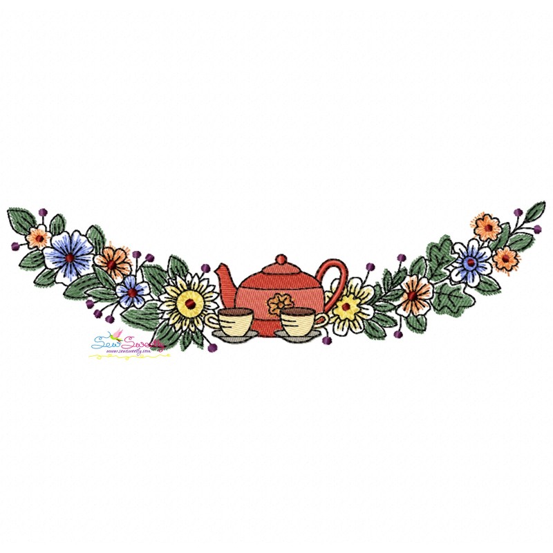 Floral Cup And Teapot Border-3 Exclusive Machine Embroidery Design Pattern For Kitchen Projects.