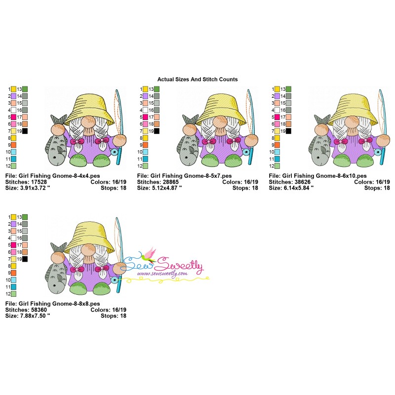Girl Fishing Gnome-8 Exclusive Machine Embroidery Design Pattern For Fishing Embroidery Projects.