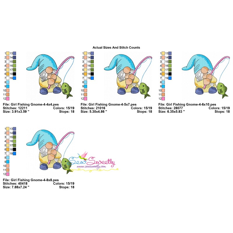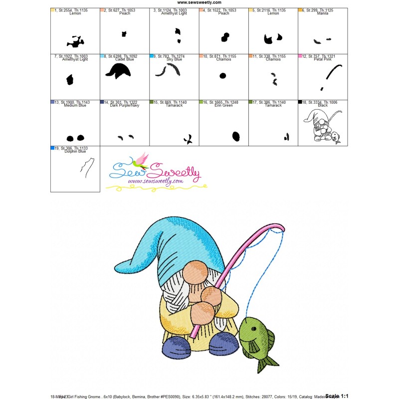 Girl Fishing Gnome-4 Exclusive Machine Embroidery Design Pattern For Fishing Embroidery Projects.