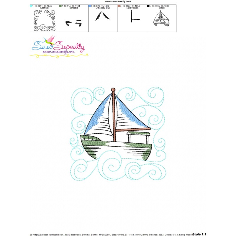Sailboat Nautical Quilt Block Machine Embroidery Design Pattern.