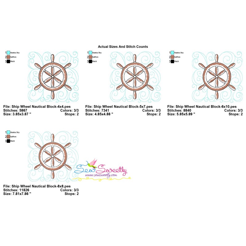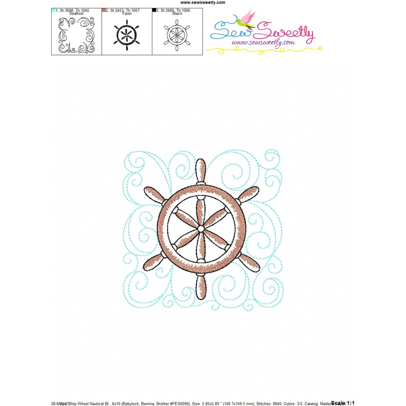 Ship Wheel Nautical Quilt Block Machine Embroidery Design Pattern.