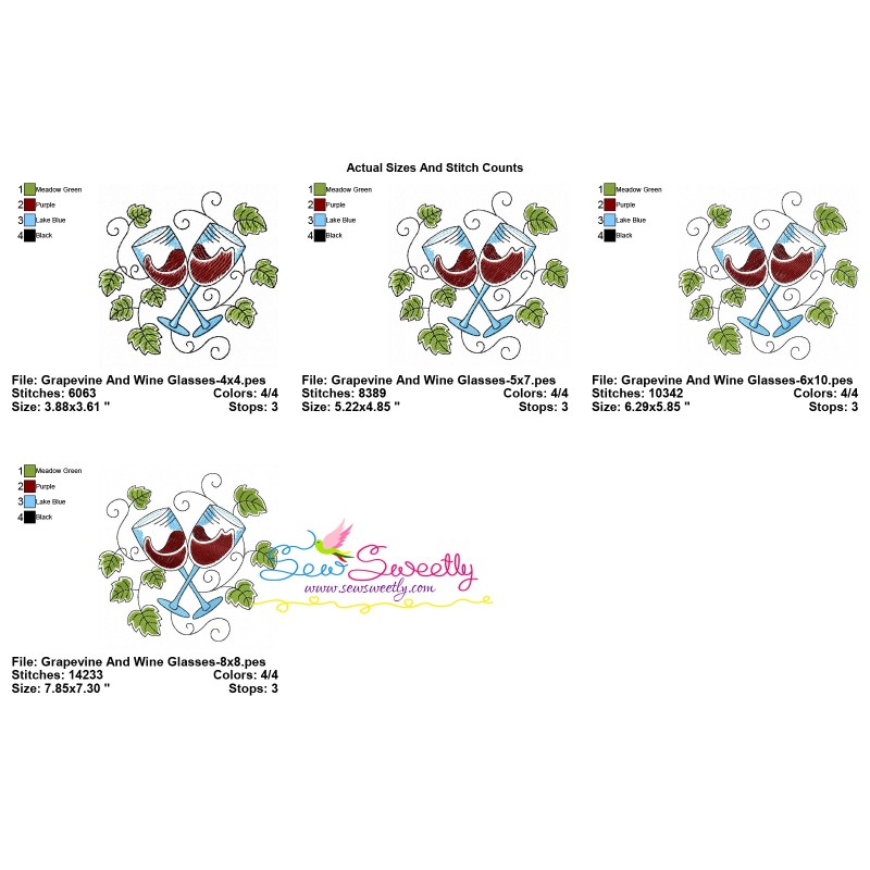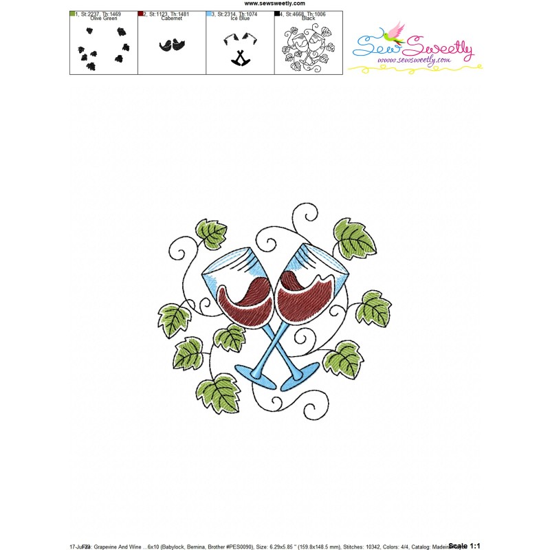 Grapevine And Wine Glasses Machine Embroidery Design Pattern.