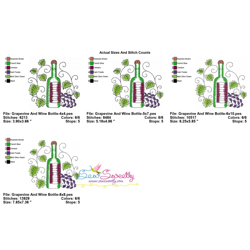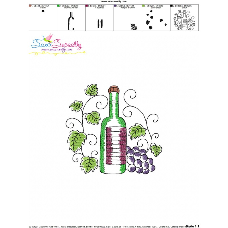 Grapevine And Wine Bottle Machine Embroidery Design Pattern.