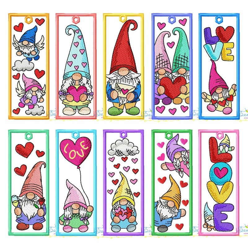 This embroidery design bundle includes 10 beautiful Valentine Gnome Bookmarks embroidery designs.